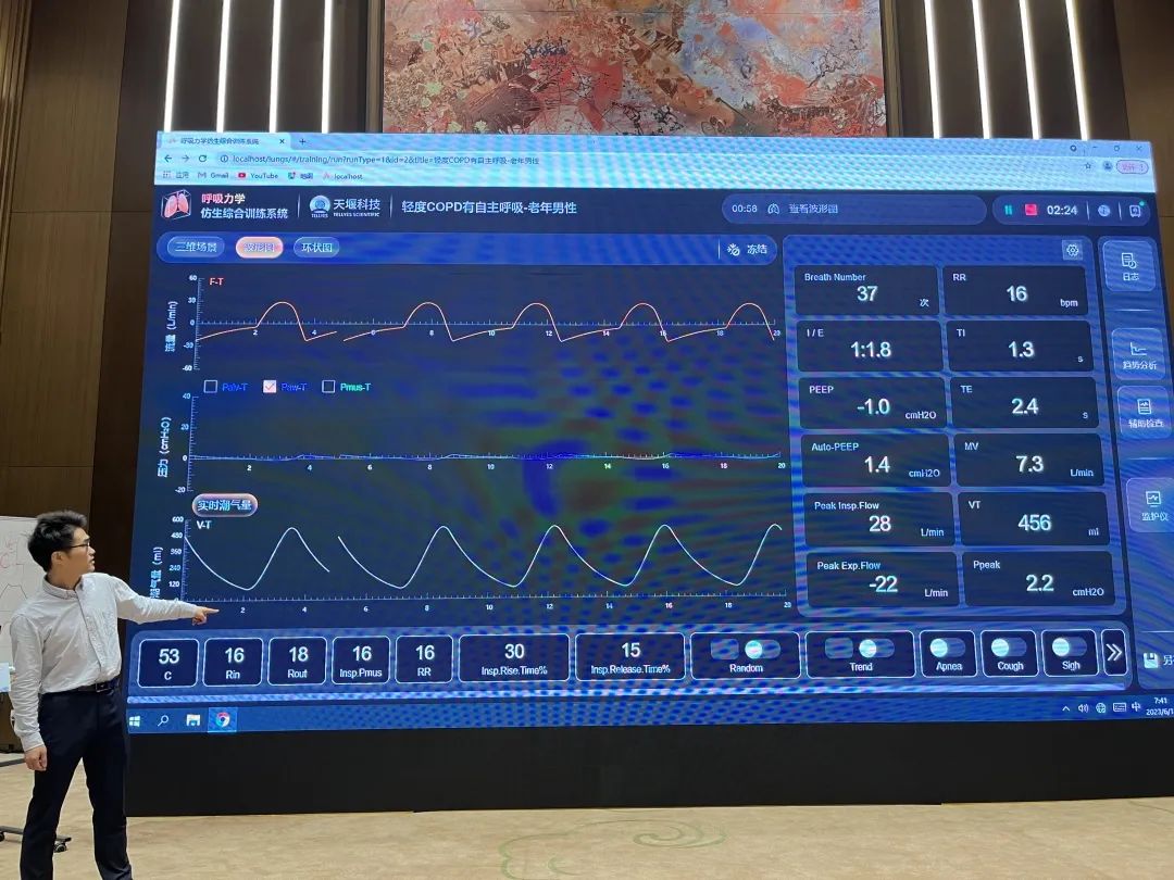 此外,來自中國科學(xué)技術(shù)大學(xué)附屬第一醫(yī)院(安徽省立醫(yī)院)的金魁主任在講授主旨為“異常波形分析”的論壇講座時,使用了天堰科技“模擬肺”內(nèi)置的呼吸力學(xué)模型——“輕度COPD有自主呼吸 老年男性”,幫助參會學(xué)員更好的理解存在肺部疾病患者機械通氣時通氣波形的特點及監(jiān)測參數(shù)異常改變。金魁主任對“模擬肺”給予了高度肯定,并建議學(xué)員課后有時間都可以進(jìn)行實操訓(xùn)練。